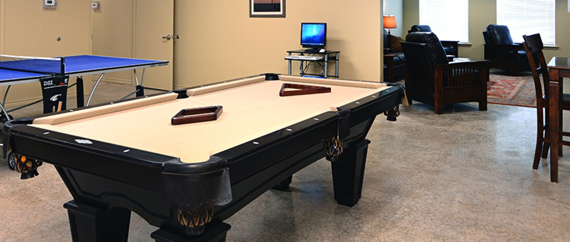Recreation room with large flat screen TV, pool table and ping pong table